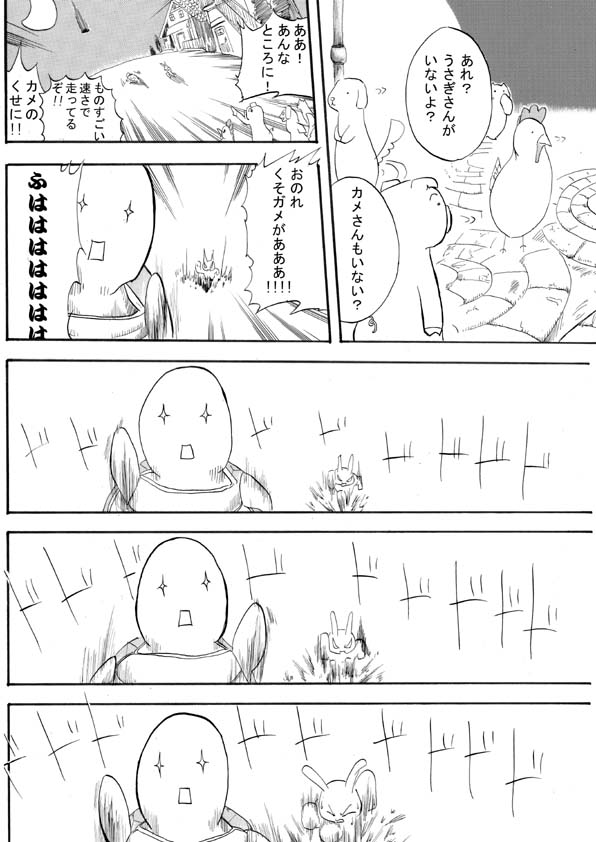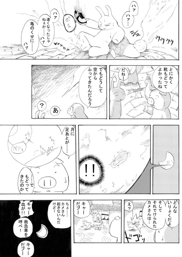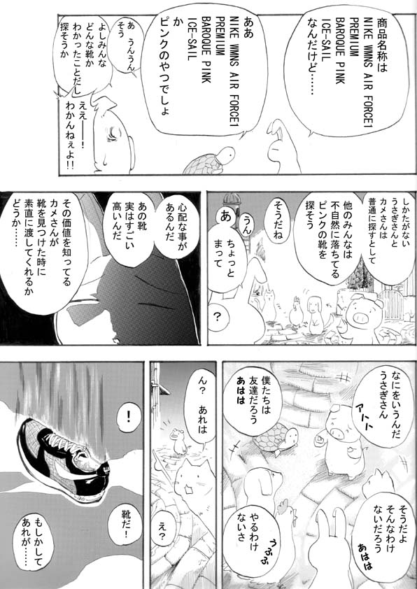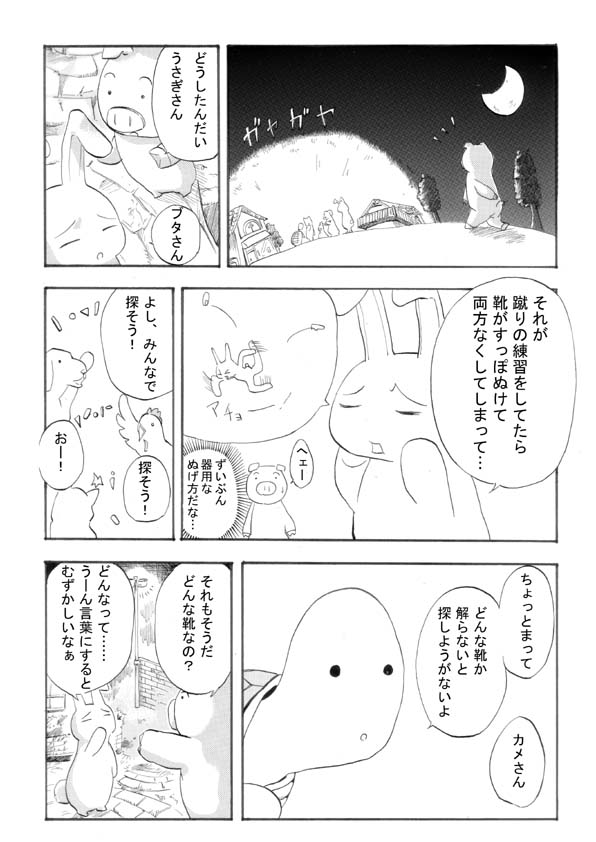 あ、こないだ言ってた弟作の漫画「うさぎとかめとくつ」載せてみます。4p漫画です。